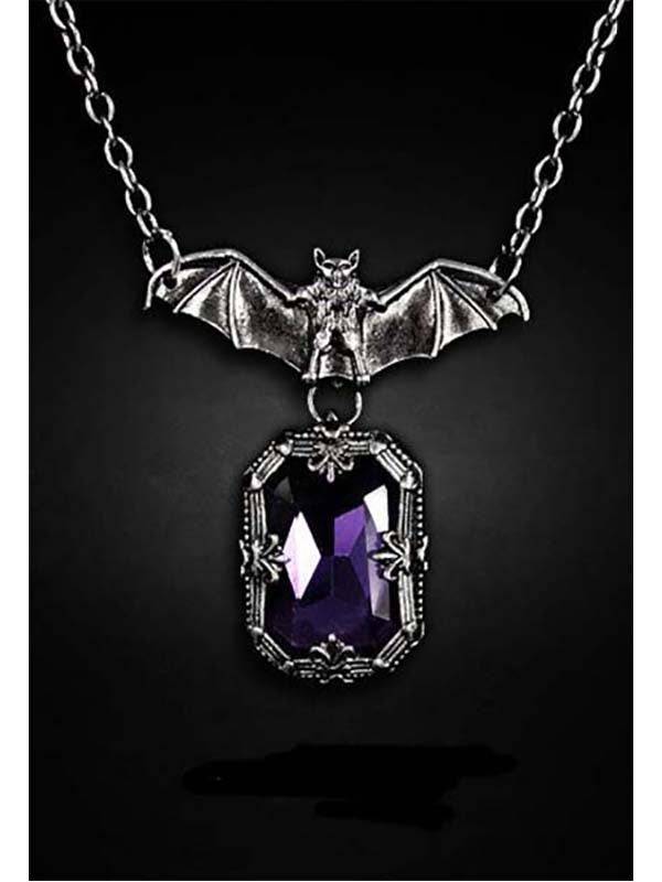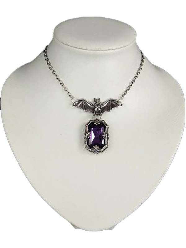 Collier chauve-souris avec pierre rectangulaire violette dans un cadre décoratif. Bijoux en alliage de zinc de couleur argent antique.