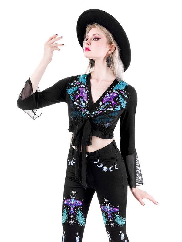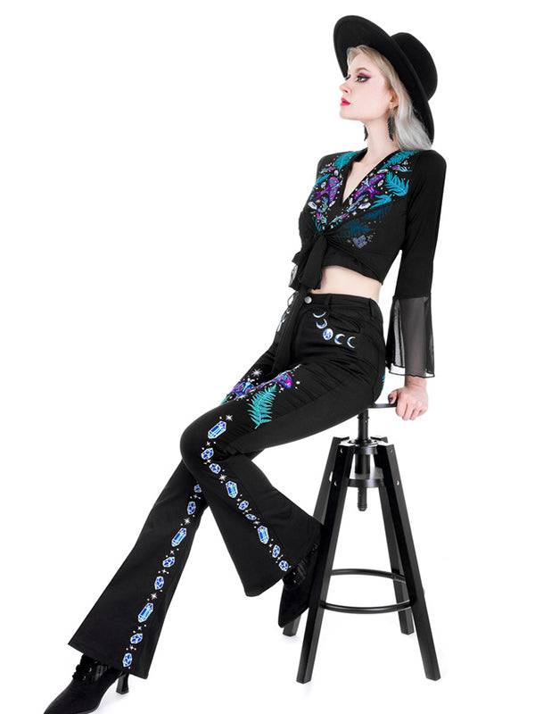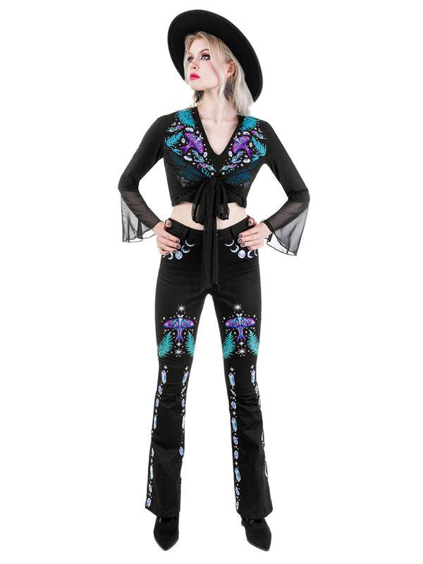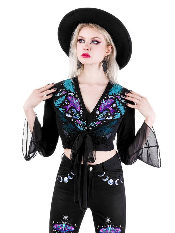 Broderie détaillée représentant des papillons de nuit magiques, des feuilles de fougère, des fleurs de lavande, des cristaux et des étoiles, le tout dans des couleurs vives.