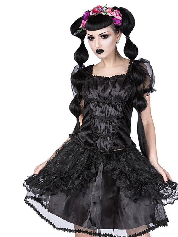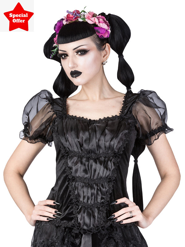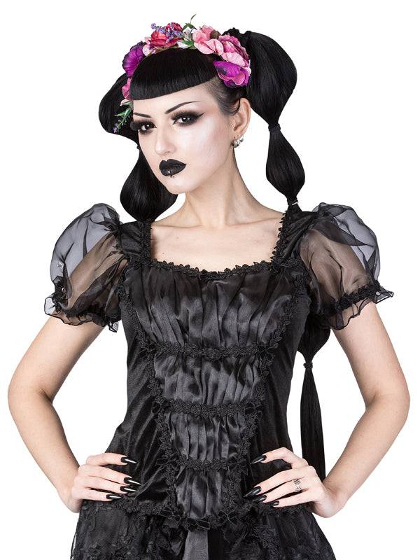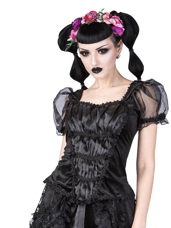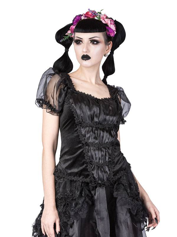 Haut en velours noir avec encolure en losange et manches bouffantes en organza noir élastiquées avec bordure en forme de feuille. Haut avec superposition d'organza rassemblée par une bordure en brocart noir. Petits noeuds en velours. Le haut est doté d'une fermeture éclair au milieu du dos.