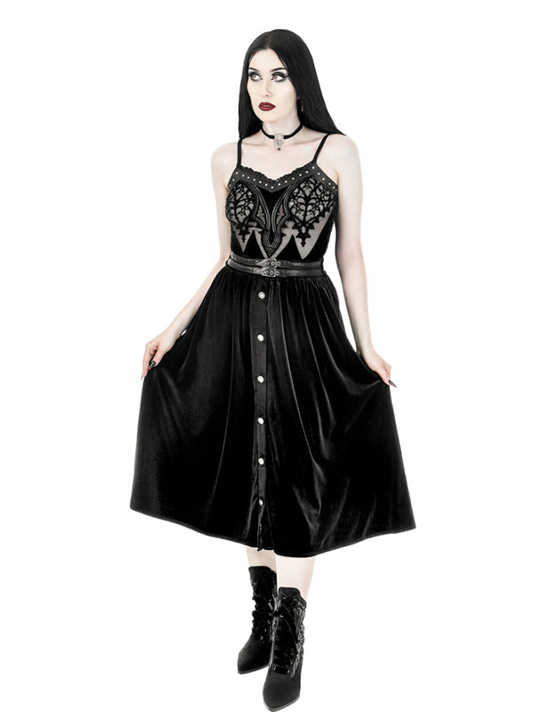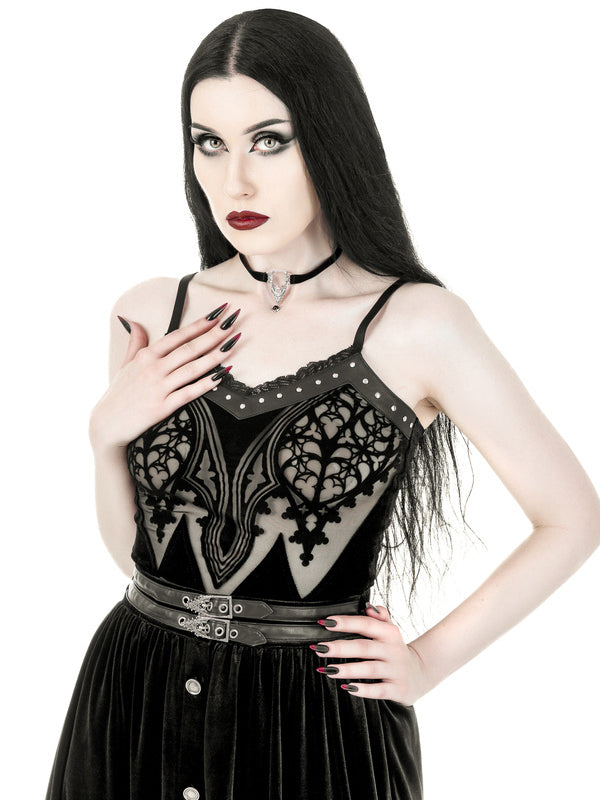 Body élégant avec col en V. Imprimé floqué « Cathedral Tracery » ur panneau en mesh, conçu pour épouser le corps. Bordure en cuir végan avec petits clous à l'encolure. La bordure en dentelle délicate ajoute une touche douce et féminine à l'esthétique sombre. Fermeture pratique par bouton-pression. Bretelles spaghetti réglables. Velours stretch : 95 % polyester et 5 % élasthanne. Mesh : 90 % nylon et 10 % élasthanne. Cuir vegan : 100 % polyuréthane.