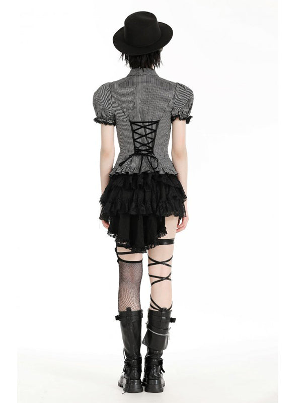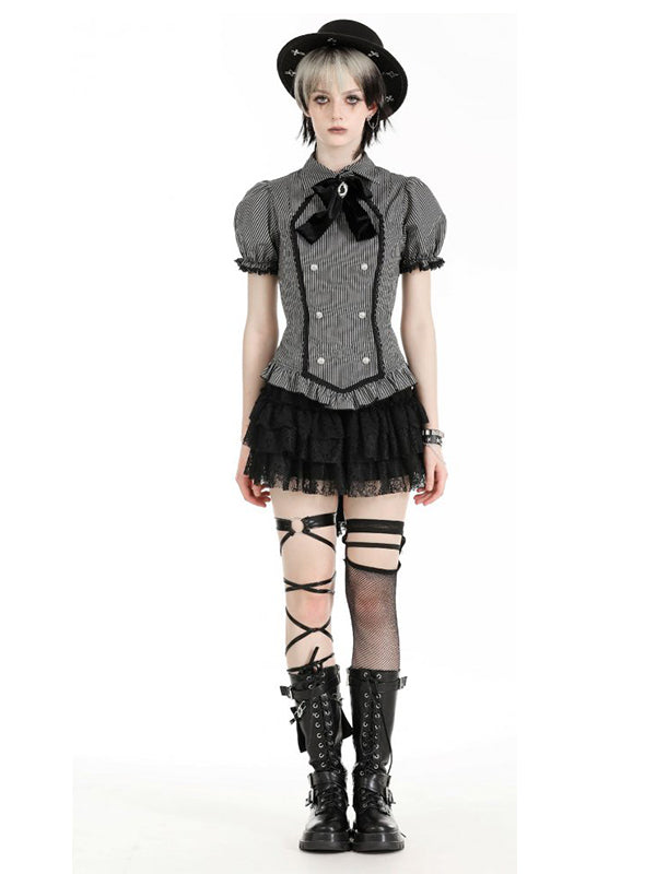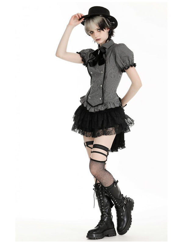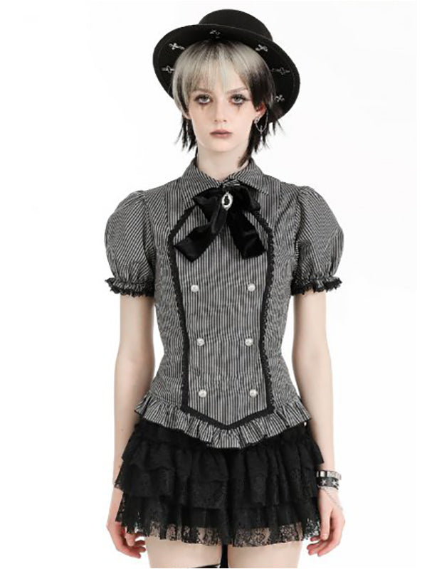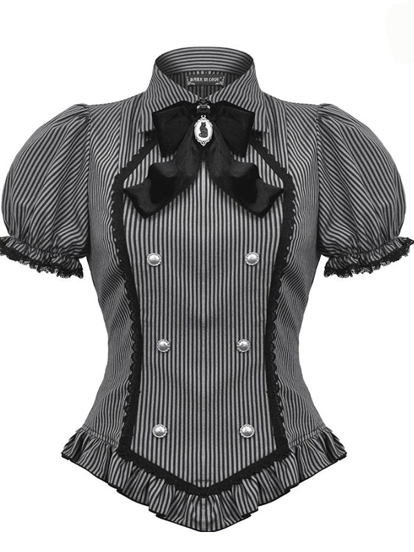 Chemisier rayé noir et gris à manches bouffantes. Orné d'un nœud au cou en velours noir avec un pendentif camée chat. Boutons à vis sur le devant. Laçage au dos. 65% Polyester 35% Coton