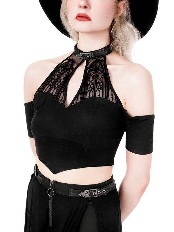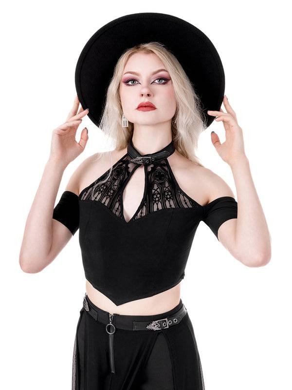 Haut ajusté avec design dos nu. Tour de cou imitation cuir contrasté avec boucle cathédrale argentée personnalisée. Panneaux en mesh imprimé floqué avec un motif « Cathédrale ». Manches ajustées 3/4. Fermeture éclair latérale dissimulée et bouton-pression. Tissu en viscose-coton doux et extensible pour plus de confort et de flexibilité.