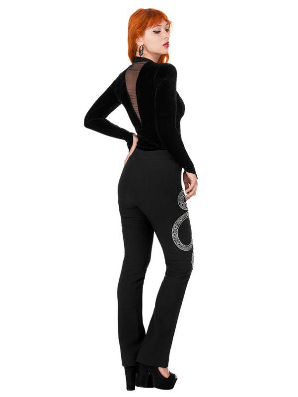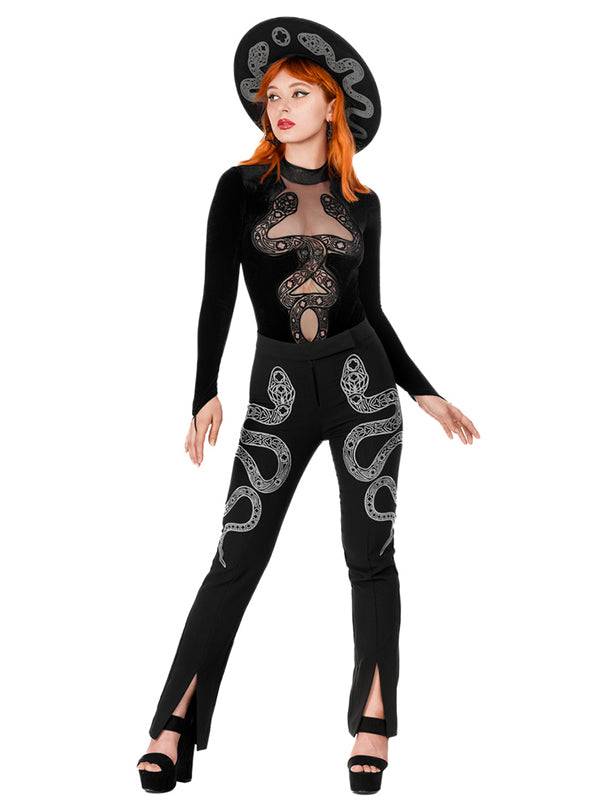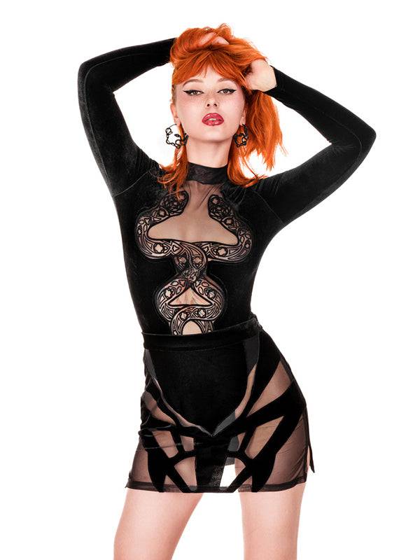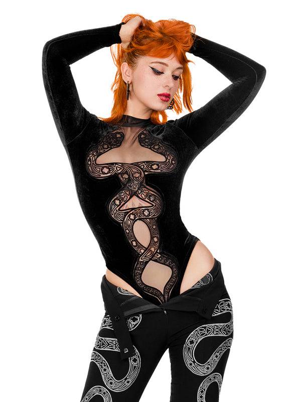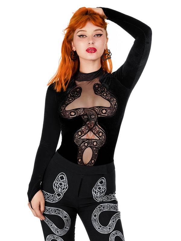 En mélange de velours et de mesh avec motif de deux serpents entrelacés. La conception des manches a été allongée en pointe et terminée avec des poignets élastiques.