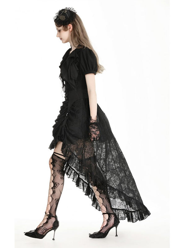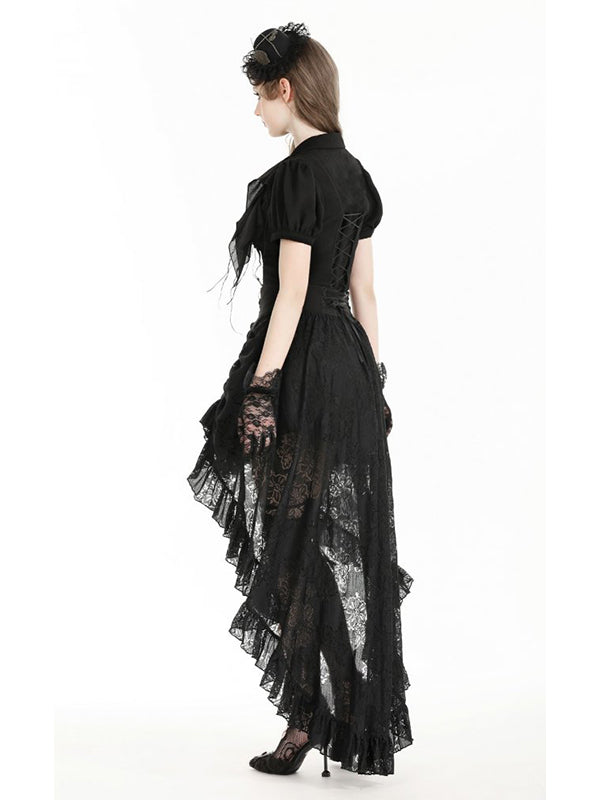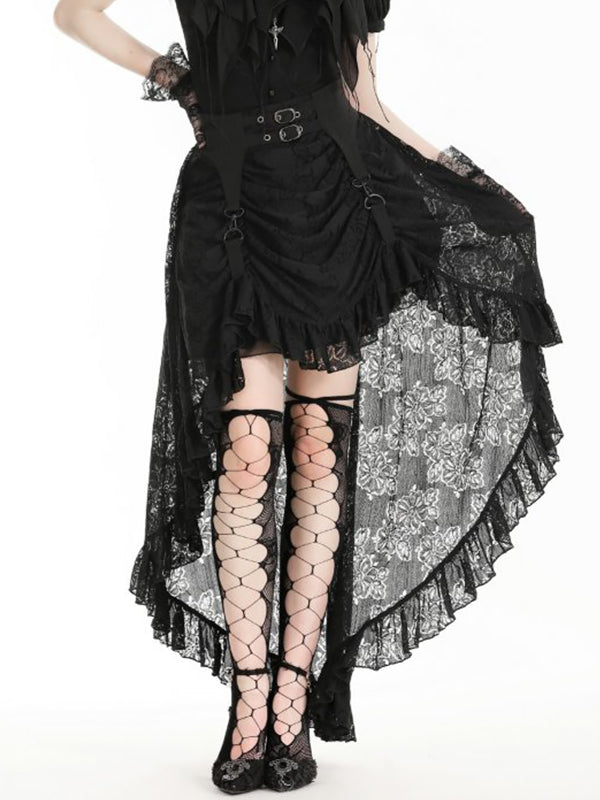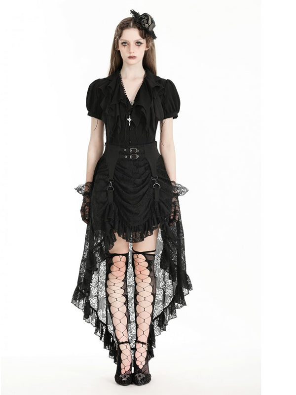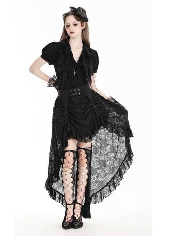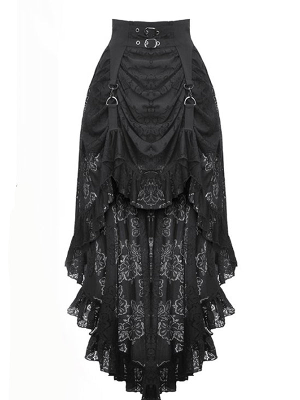 Jupe 2 longueurs en tissu luxueux en dentelle noire pour une touche dramatique. Devant drapé avec bretelles clipsées. Sangles avec boucles décoratives à la taille. Laçage au dos. Fermeture éclair. 100% nylon.
