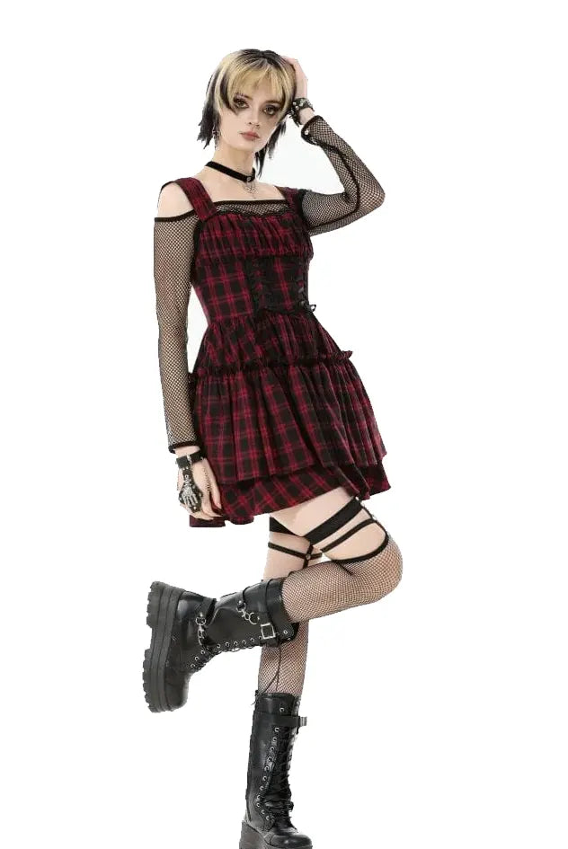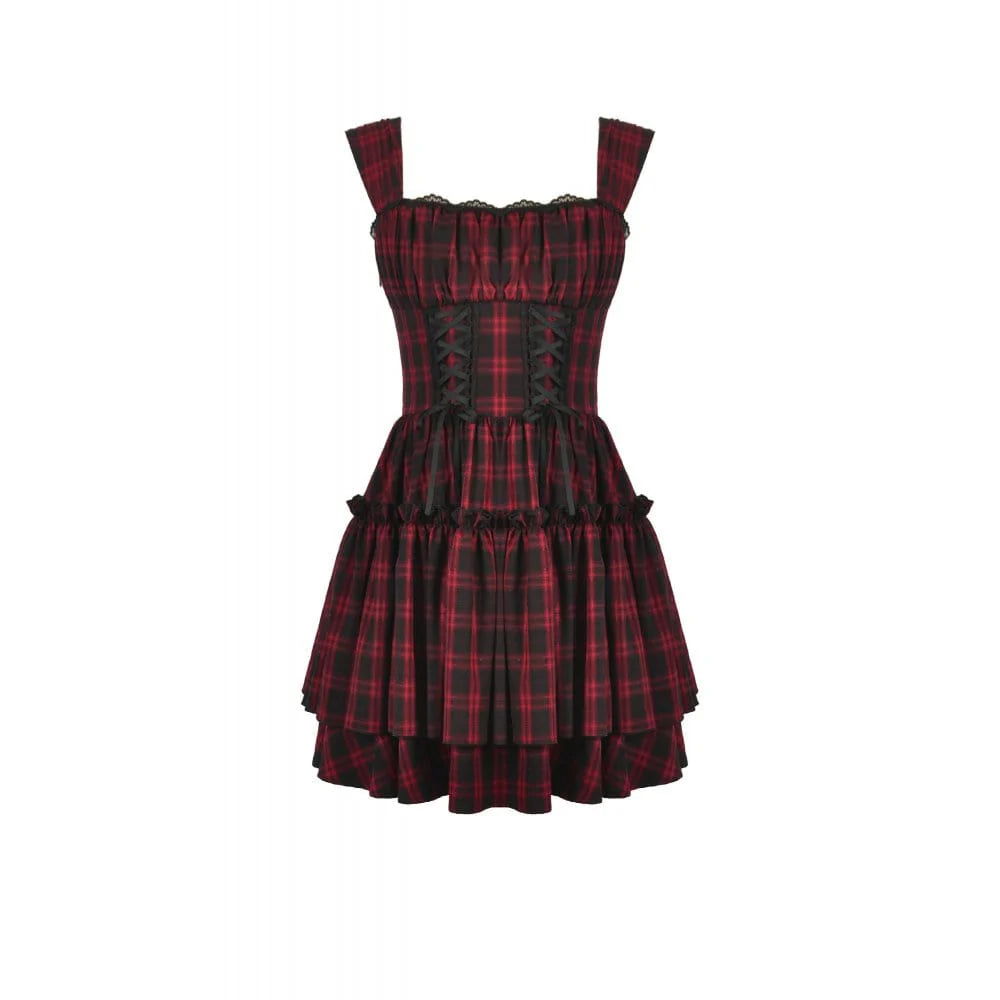This Christmas plaid dress features a festive red-and-black diamond-pattern fabric with a subtle textured finish. The ruched bust is delicately trimmed with lace, adding a touch of sweetness, while the wide pleated straps enhance the playful silhouette. Its double-layered cake skirt creates a voluminous, youthful look. Designed with a shirred back for a comfortable and flattering fit, this dress blends holiday charm with a sweet punk vibe—perfect for Christmas parties or cute everyday styling.