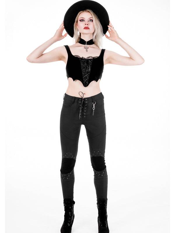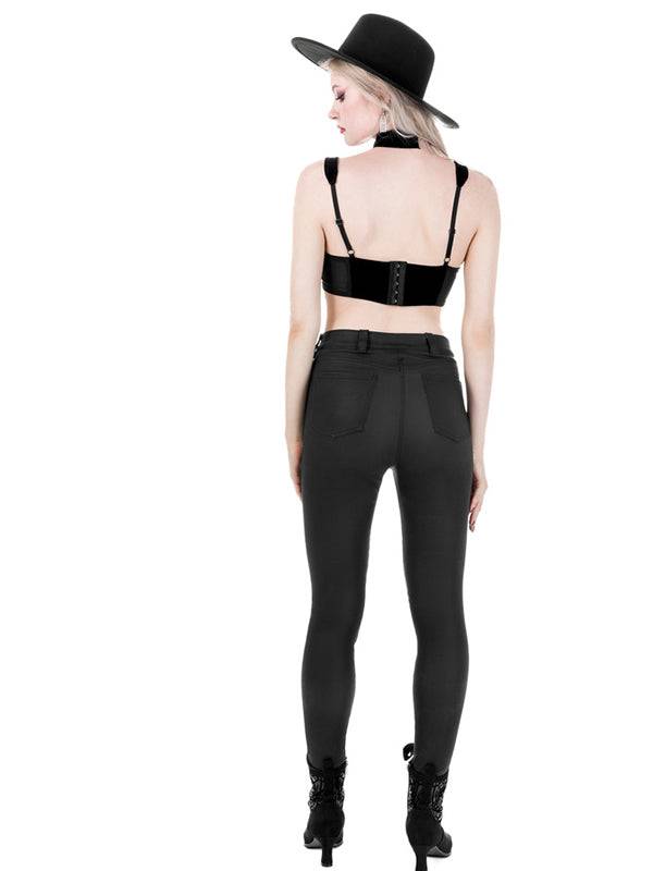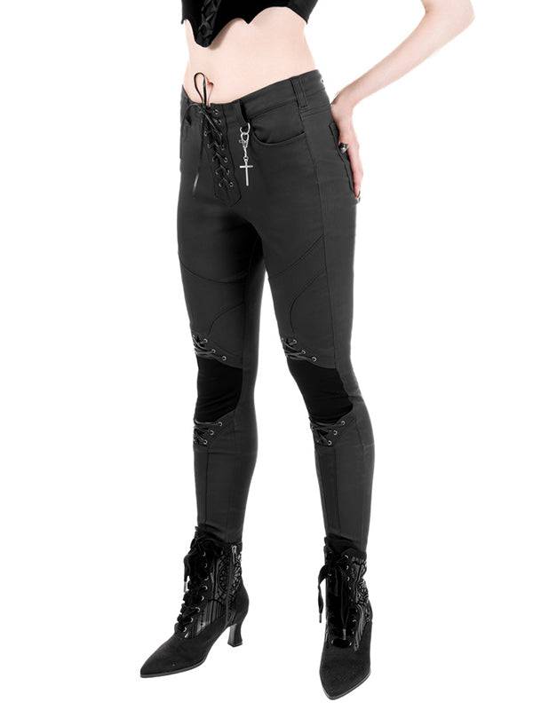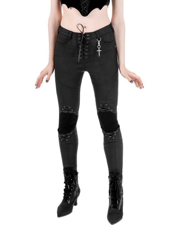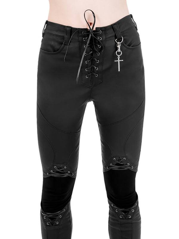 Pantalon skinny élégant taille haute avec une coupe flatteuse. Lacet sur le devant, avec œillets métalliques et cordon imitation cuir. Empiècements contrastés aux genoux avec lacets. Poches avant et arrière. Tissu extensible enduit qui offre un look « denim ciré » saisissant. Passants de ceinture avec anneau en D et breloque croix détachable.