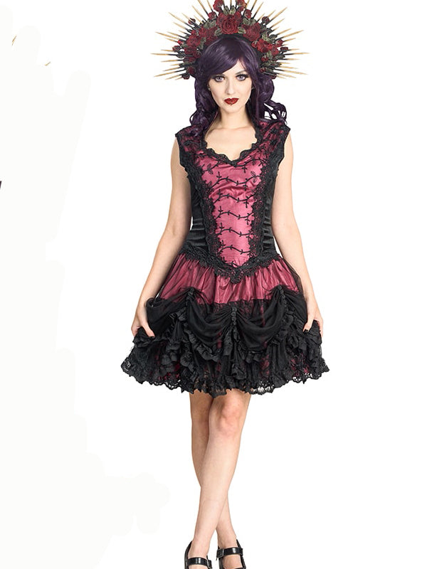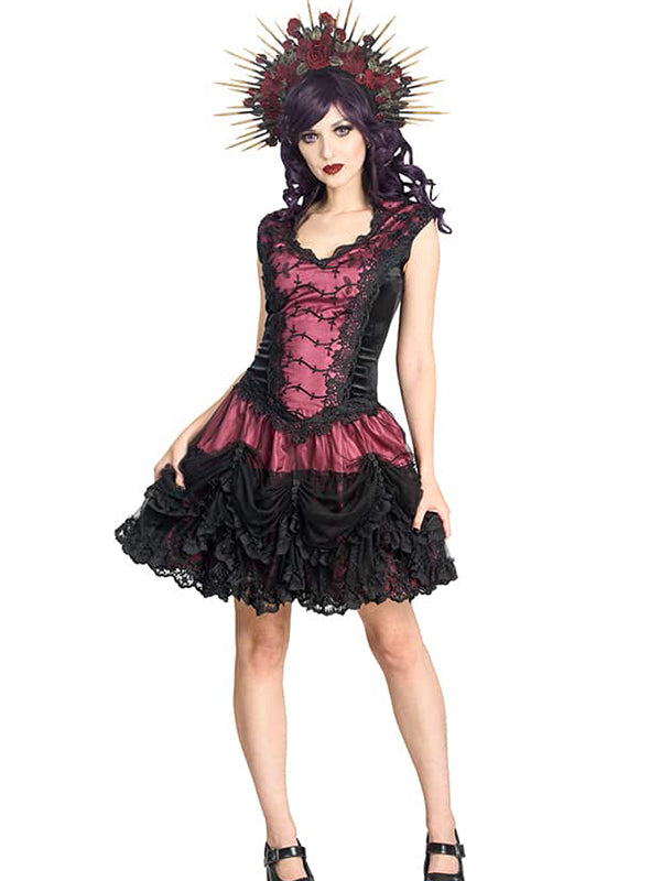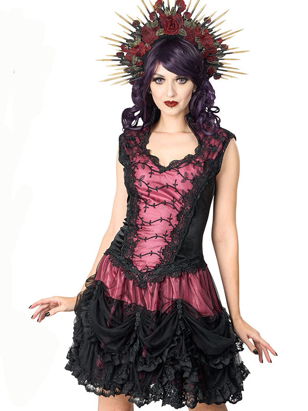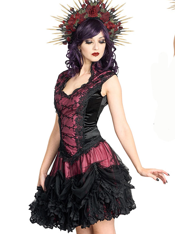 Robe délicate avec une jupe à volants en maille douce et dentelle brodée. Le haut en velours présente un subtil col vampire et un décolleté en cœur orné de dentelle brocart. La jupe fluide se compose de deux volants : le premier en maille noire froncée par une rangée de roses en satin noir, est ornée d'une bordure en dentelle vénitienne et de volants en dentelle noire. En dessous, des volants en dentelle brodée complète le look. La jupe est entièrement doublée d'un satin doux et soyeux et la robe est dotée d'une fermeture éclair dissimulée au milieu du dos.