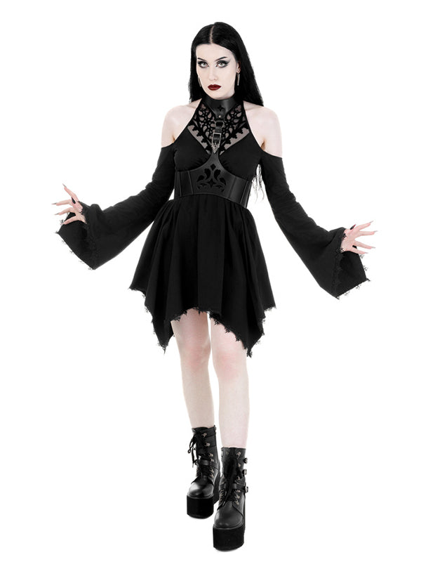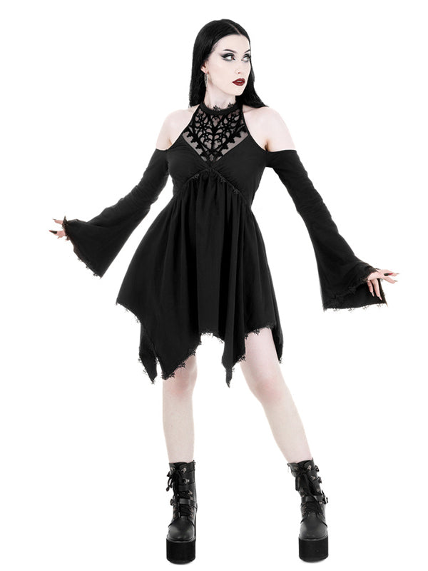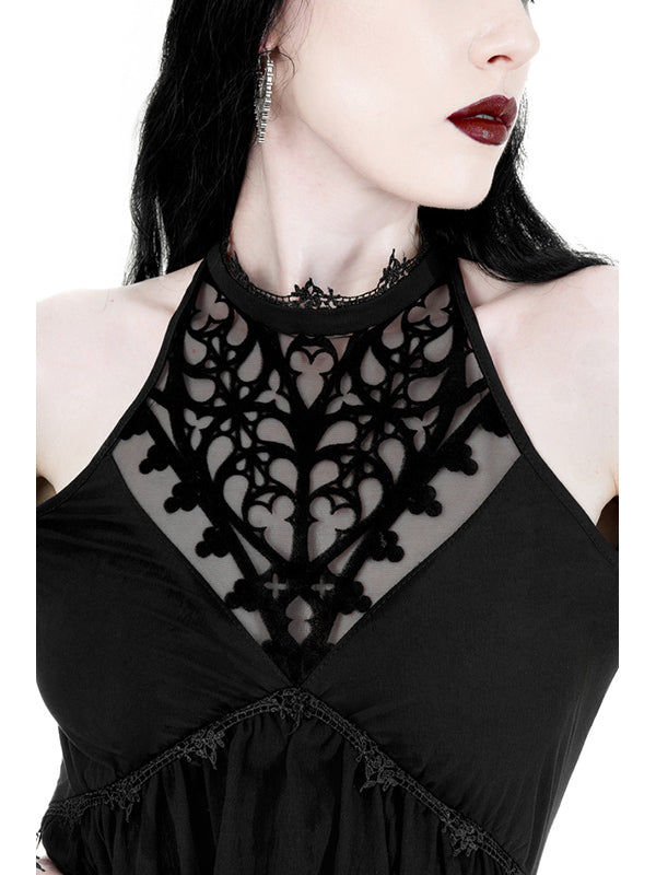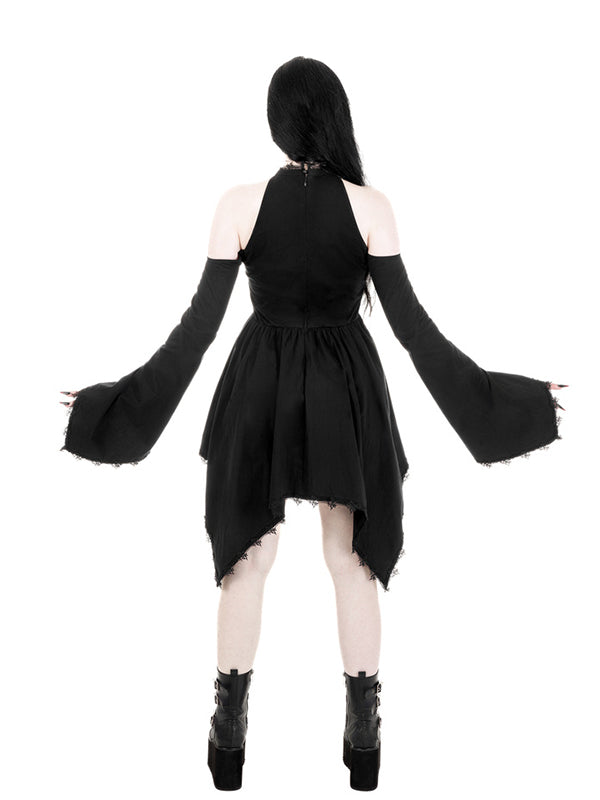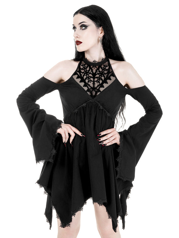 Robe gothique élégante. Panneau en maille transparente sur la poitrine avec imprimé floqué. Bordure en dentelle complexe rappelant les flèches des cathédrales au niveau du col, de la taille, des manches et de l'ourlet. Ourlet asymétrique. Manches longues et évasées. Découpes aux épaules et dos. Taille ajustée froncée avec élastique confortable au dos. Fermeture éclair dissimulée au milieu du dos. Bouton et passant au cou. Tissu à base de coton légèrement extensible. Tissu extensible (97 % coton, 3 % élasthanne)