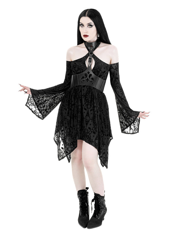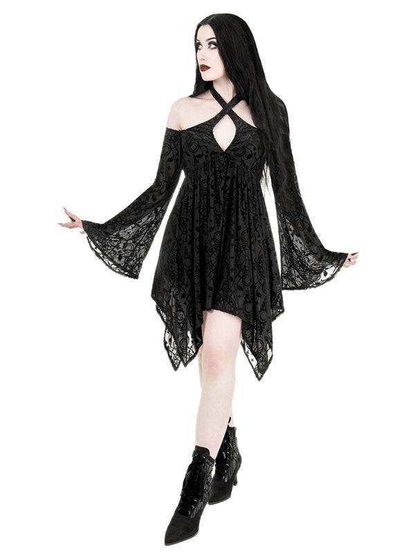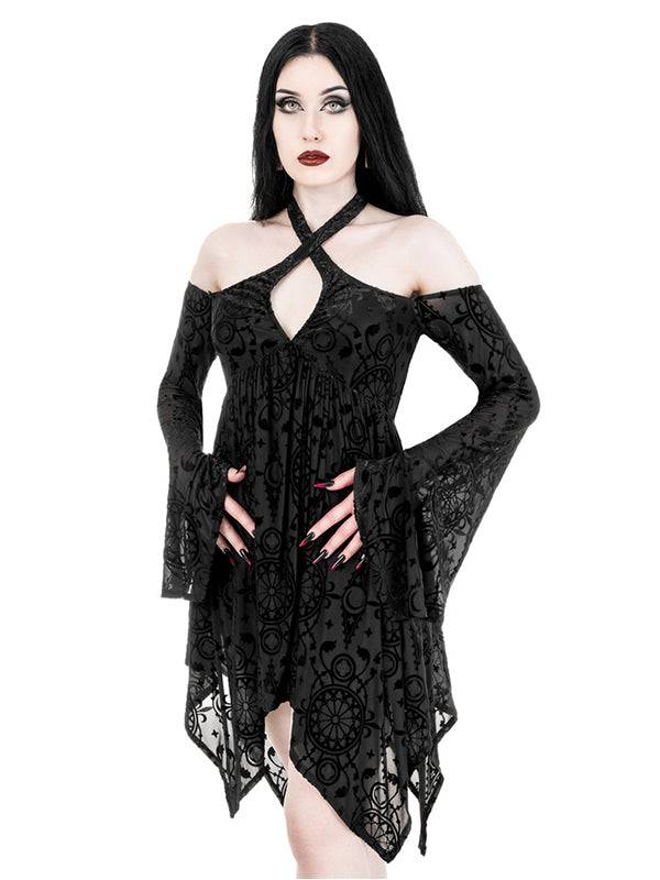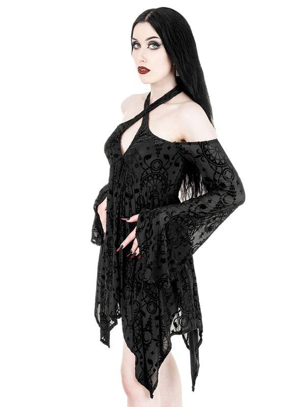 Robe courte en velours présentant des motifs cathédrale originaux.