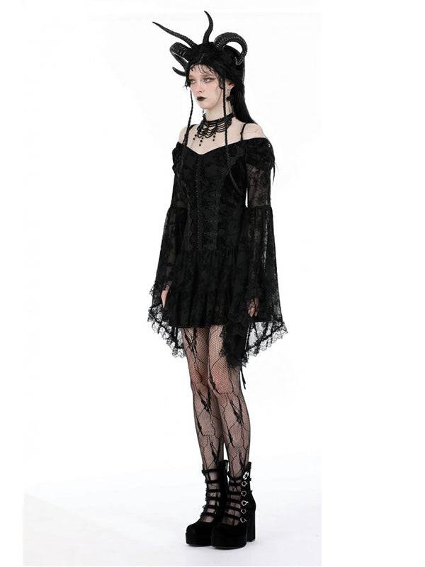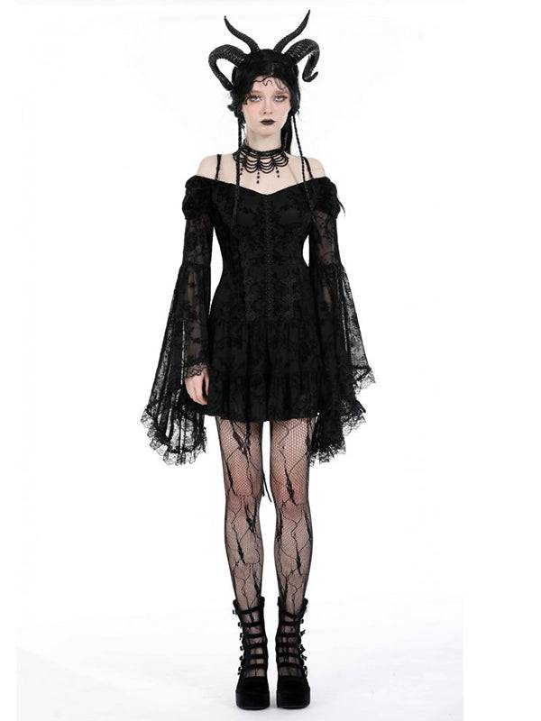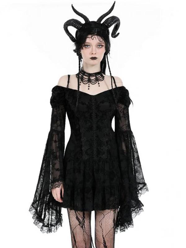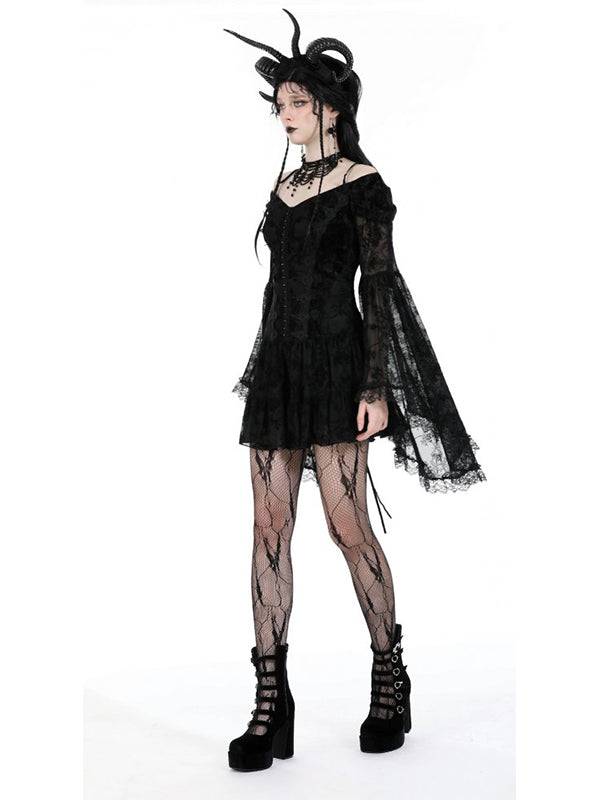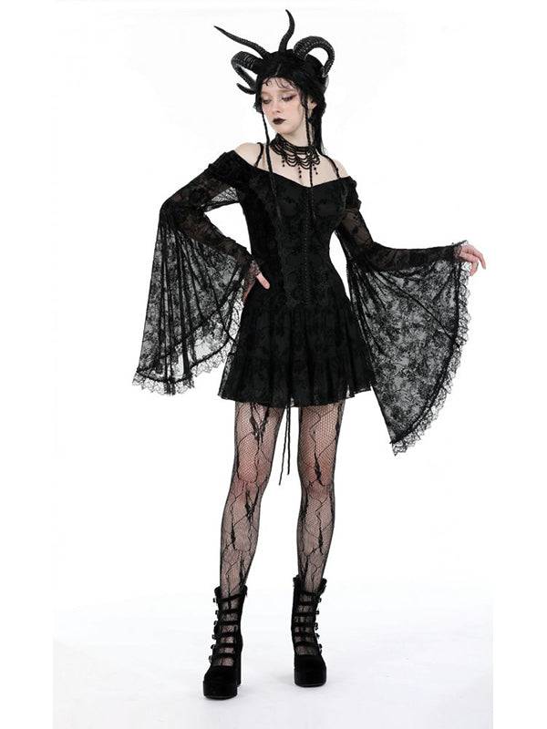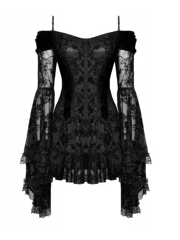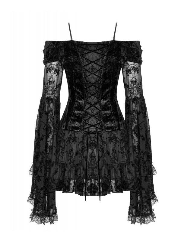 Robe courte élégante en dentelle noire et velours. À manches larges et longues avec épaules et bretelles visibles. Le devant présente un design boutonné, tandis que le dos est orné de lacets croisés. 100% polyester.