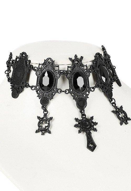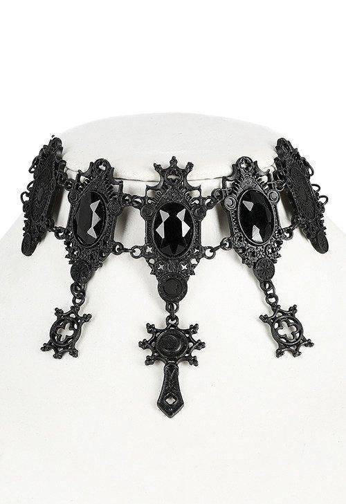 Tour de cou très élégant à l'esthétique gothique avec une texture à l'ancienne. Orné de trois belles pierres noires polies. Les pierres sont dans des cadres incroyablement détaillés. Il y a trois petits pendentifs uniques suspendus librement sur le cou. Vous pouvez ajuster le tour de cou à votre cou par une chaîne noire.