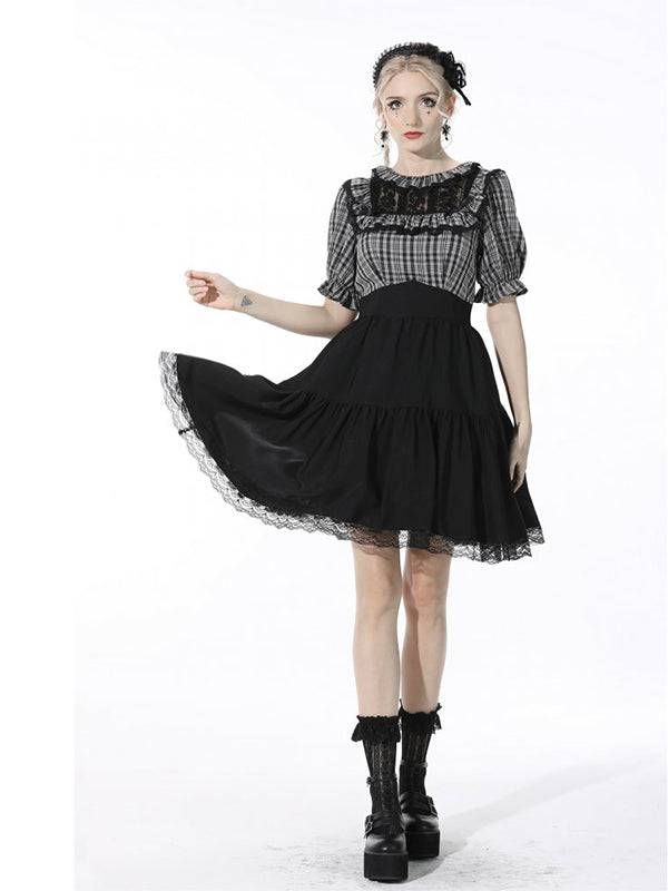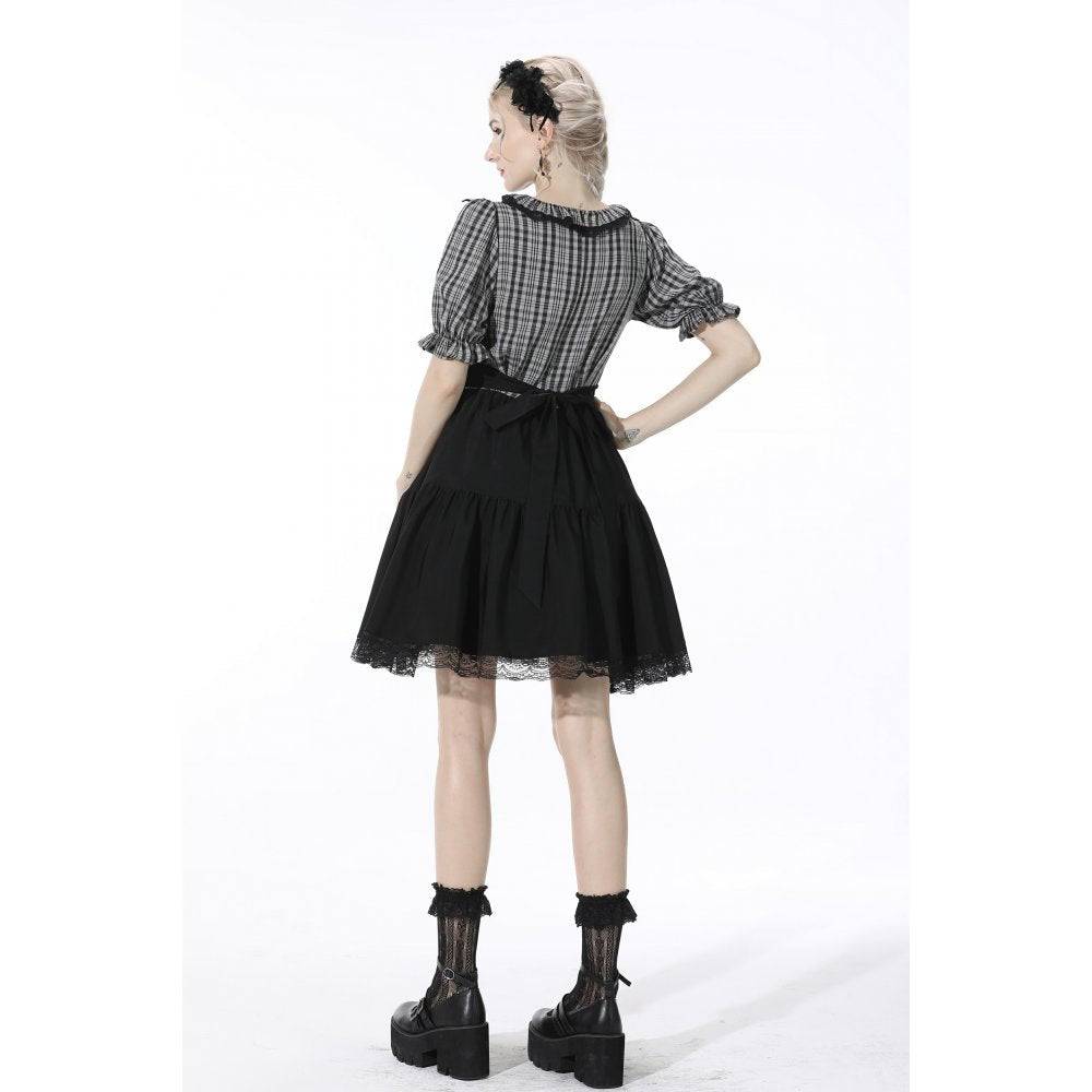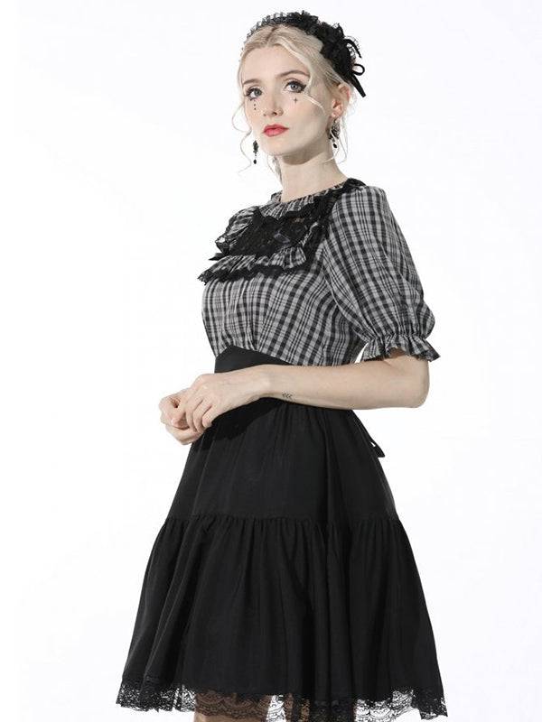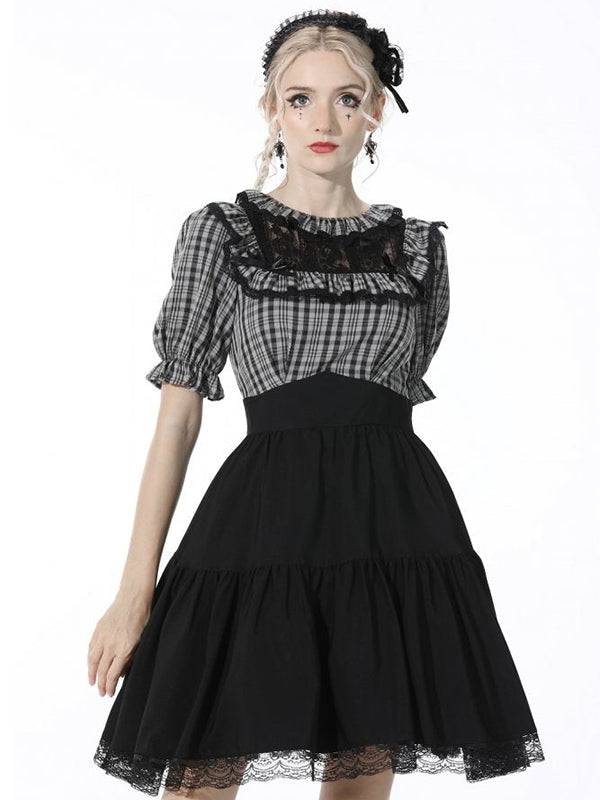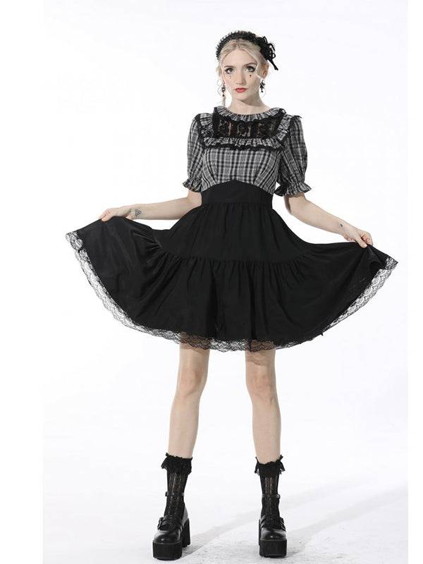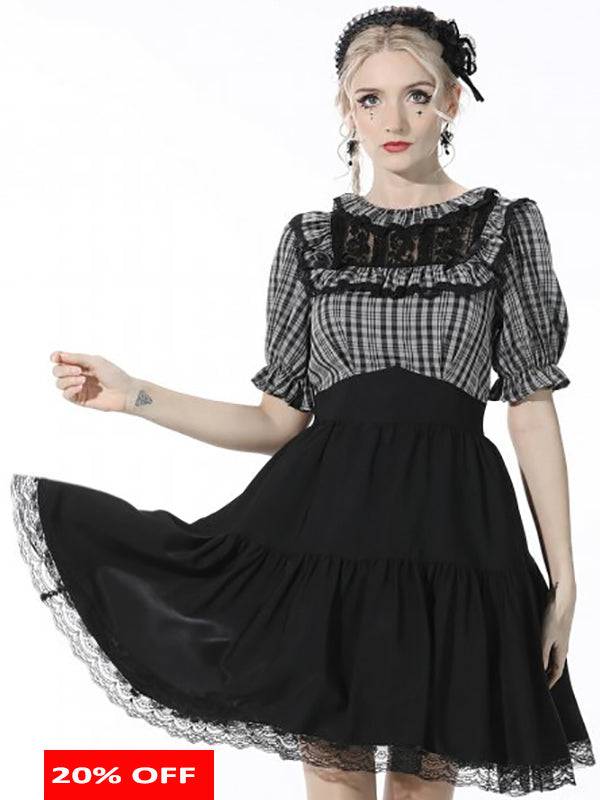 Robe noire et tartan gris. Haut avec manches à volants et détails en dentelle. Fermeture par un zip dissimulé au dos avec une ceinture à nouer. Entretien - Lavage à la main recommandé. Tissu : 60% rayonne, 40% polyester