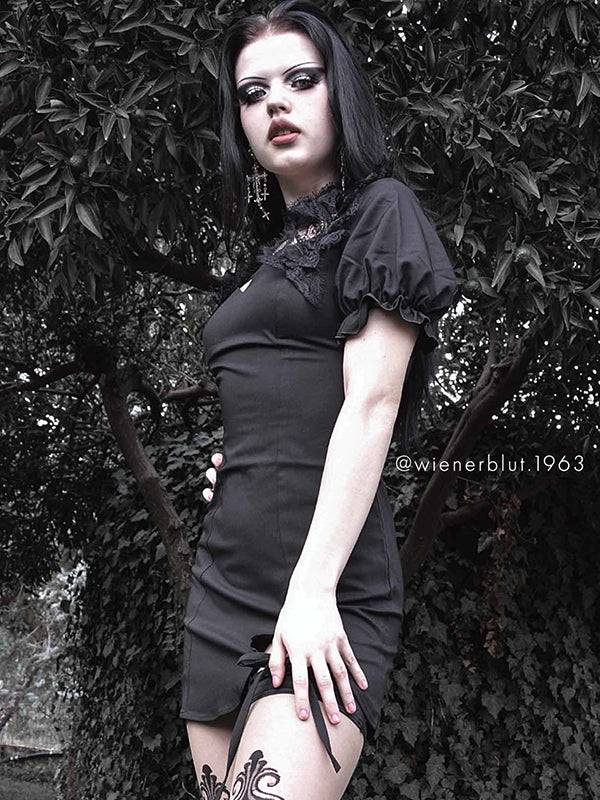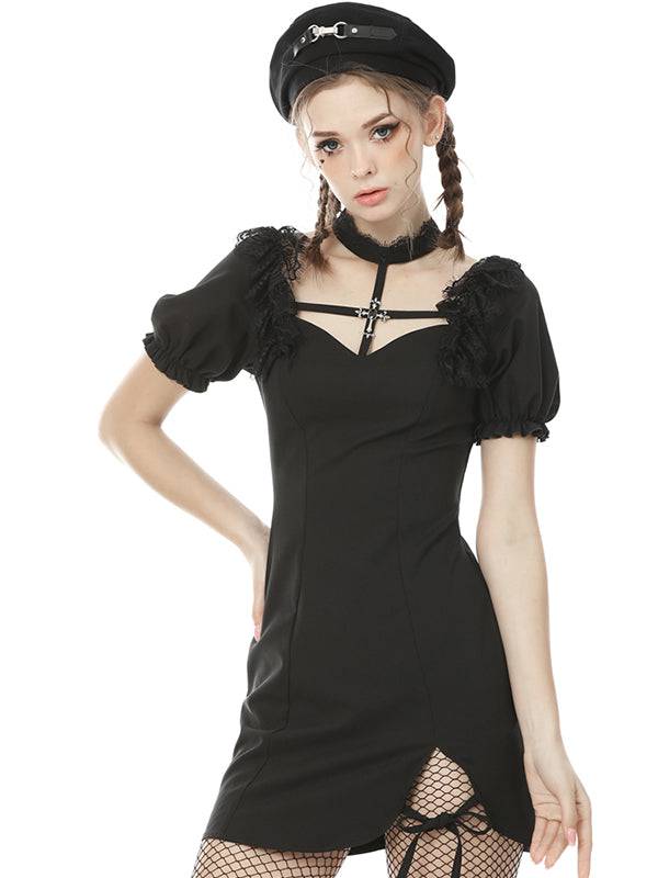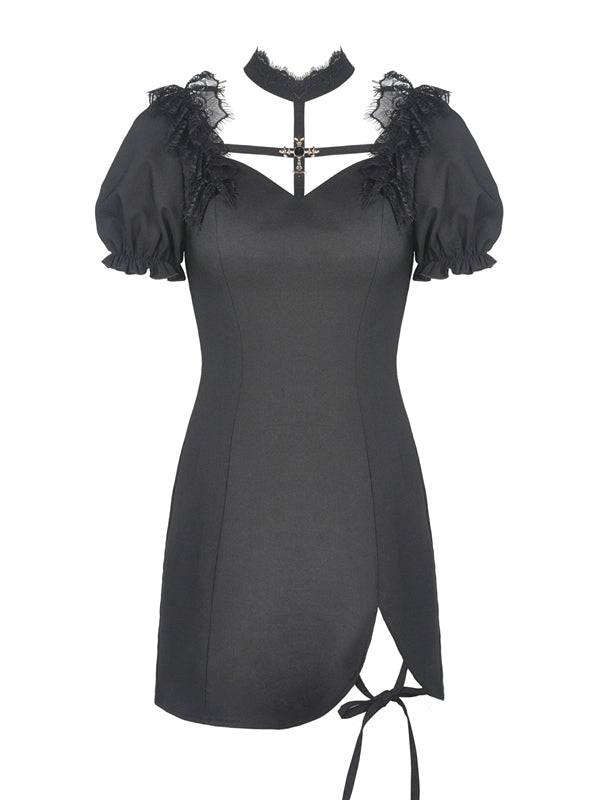 Robe courte noire avec manches bouffantes, tour de cou dentelle et croix.