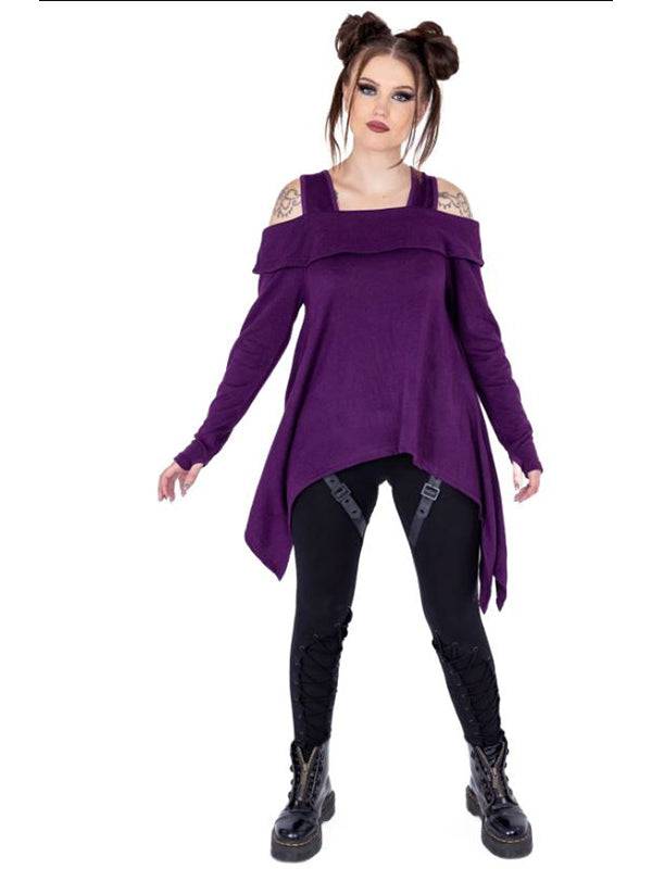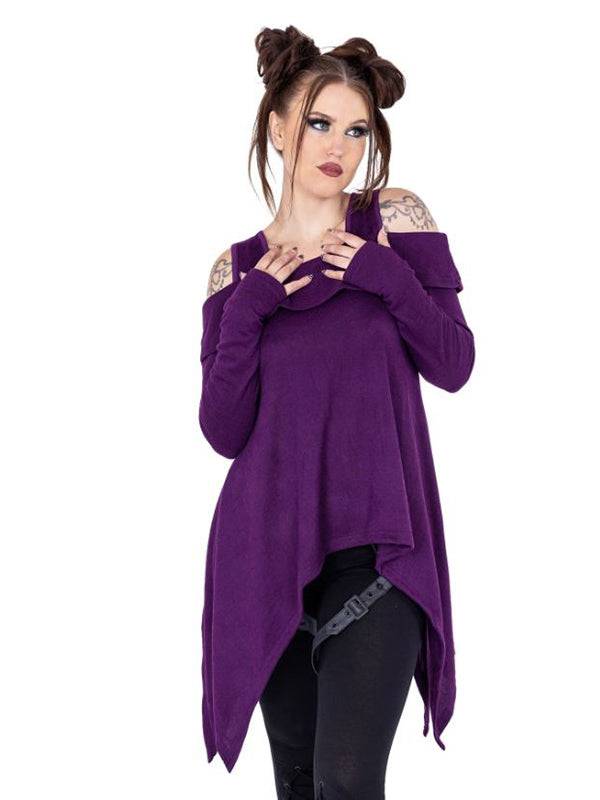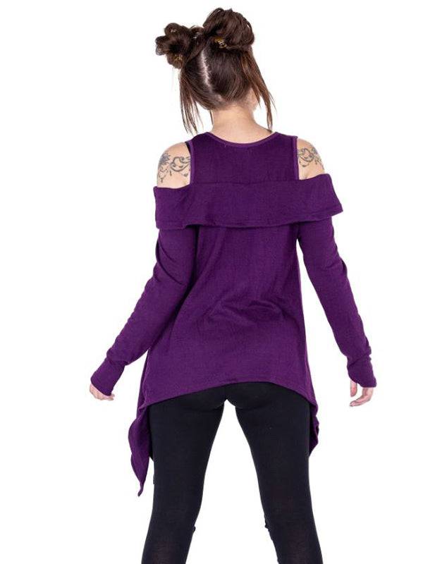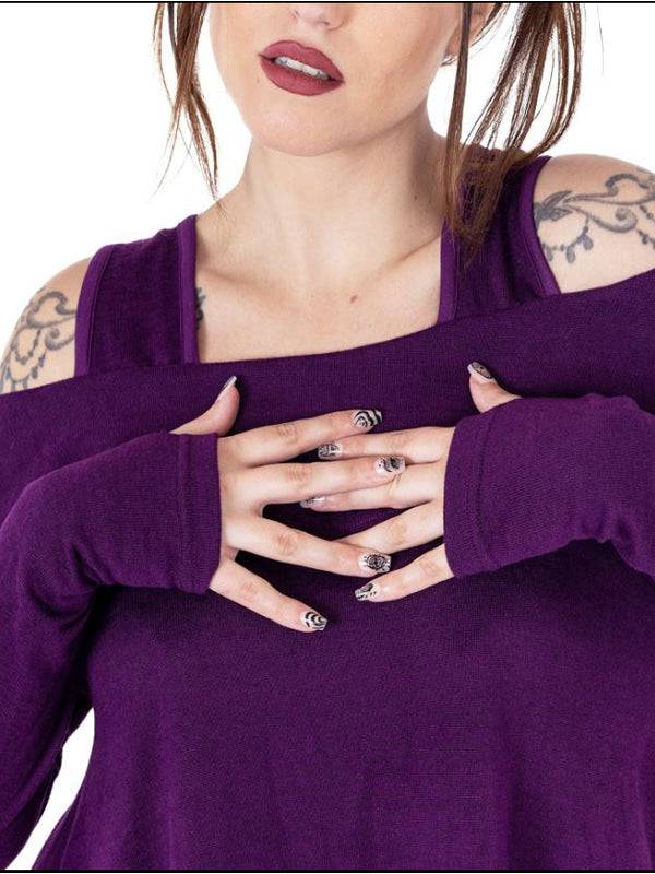 Tissu tricoté doux violet, modèle épaules dénudées. Manches extra longues avec trous pour les pouces. 100% Polyester.