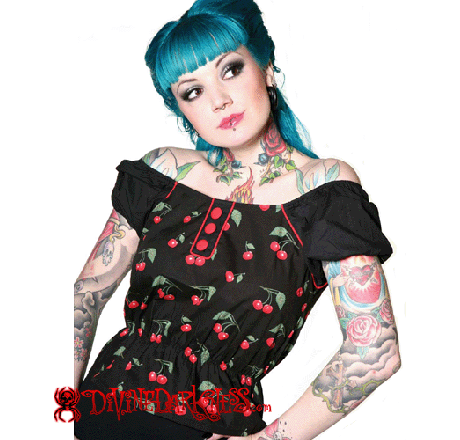 Haut noir avec manches bouffantes impression cerise. Décoré de petits boutons rouges