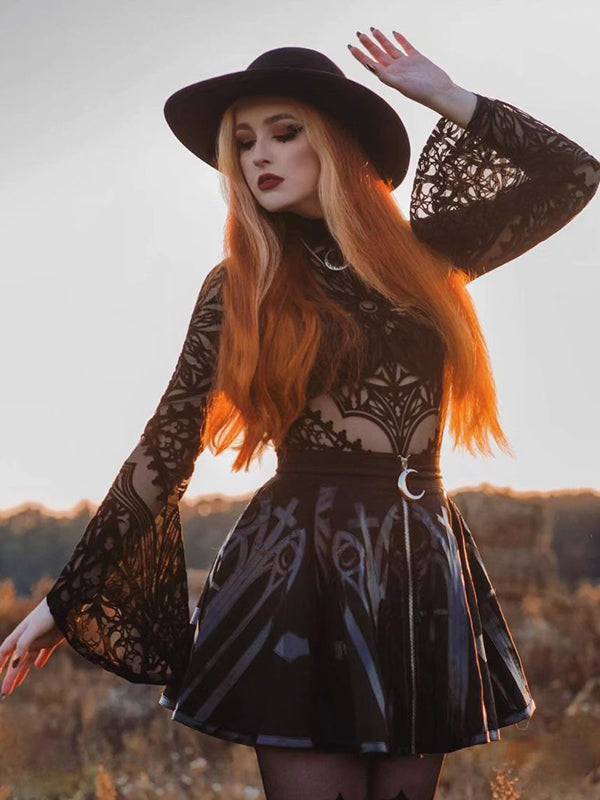 La jupe est circulaire, et en même temps elle est assez rigide. Grâce à cela, elle crée une ligne élégante. La mini-jupe est fermée par une fermeture éclair en métal ornée d'un grand croissant de lune décoratif.