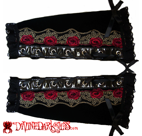 Armwarmers en velours noir et pvc noir avec roses brodées