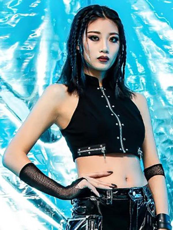 Haut court en coton avec décorations en métal et fermetures éclair sur le devant et sur les cotés.