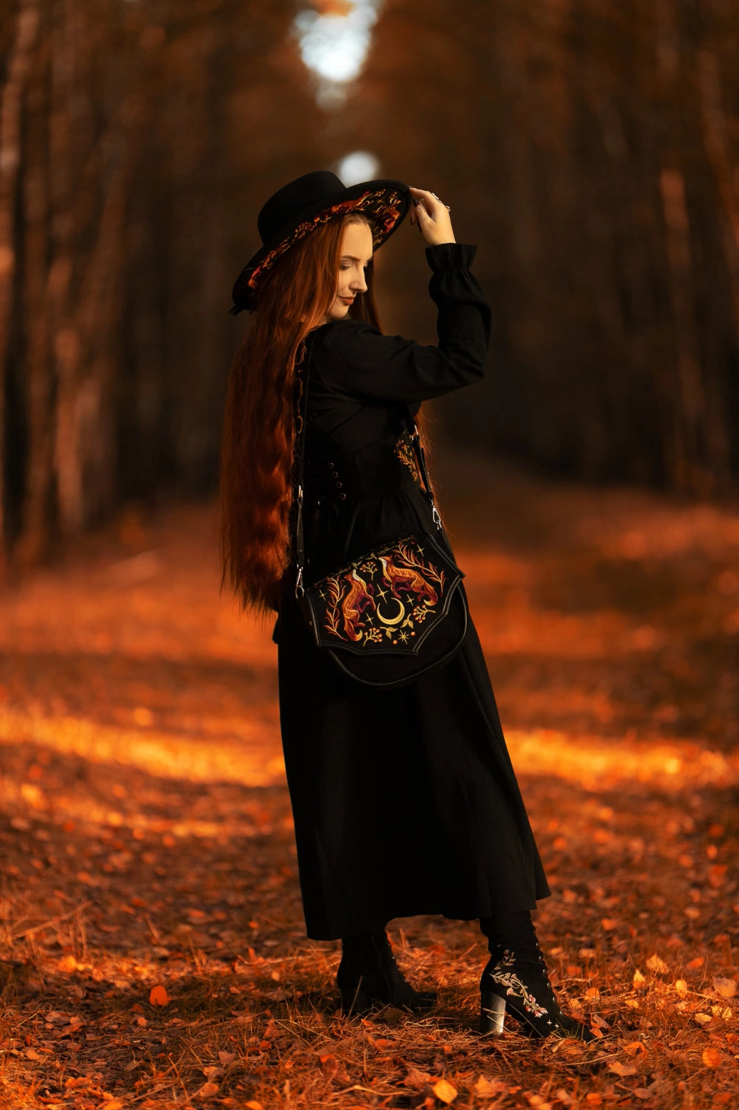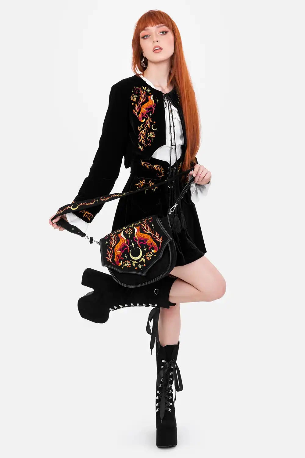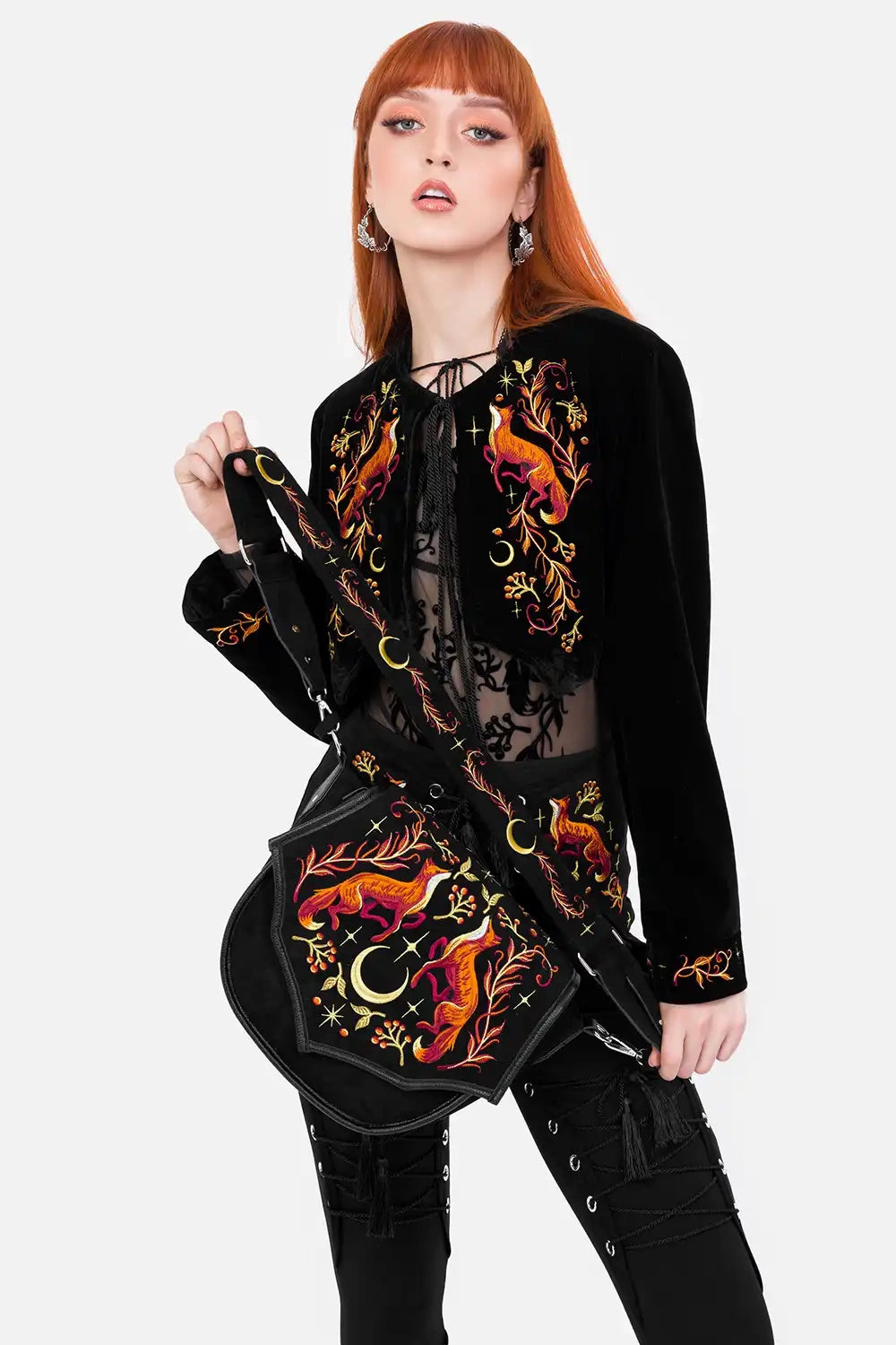 A fierce and enchanting fox bag for lovers of dark whimsy, witchy fashion, and forestcore style. The black faux suede bag is adorned with fiery red fox embroidery, glowing like embers in the night. Inspired by dark fairytales and forest magic, this nature-inspired bag blends boho mystique with gothic elegance, making it perfect for modern witches, wild souls, and moonlit wanderers.