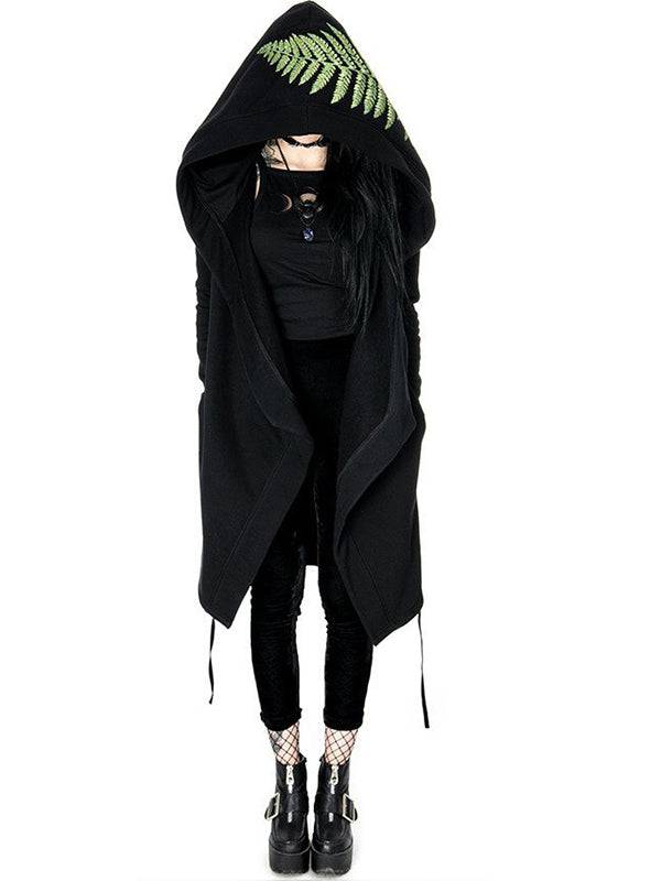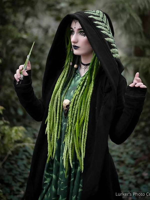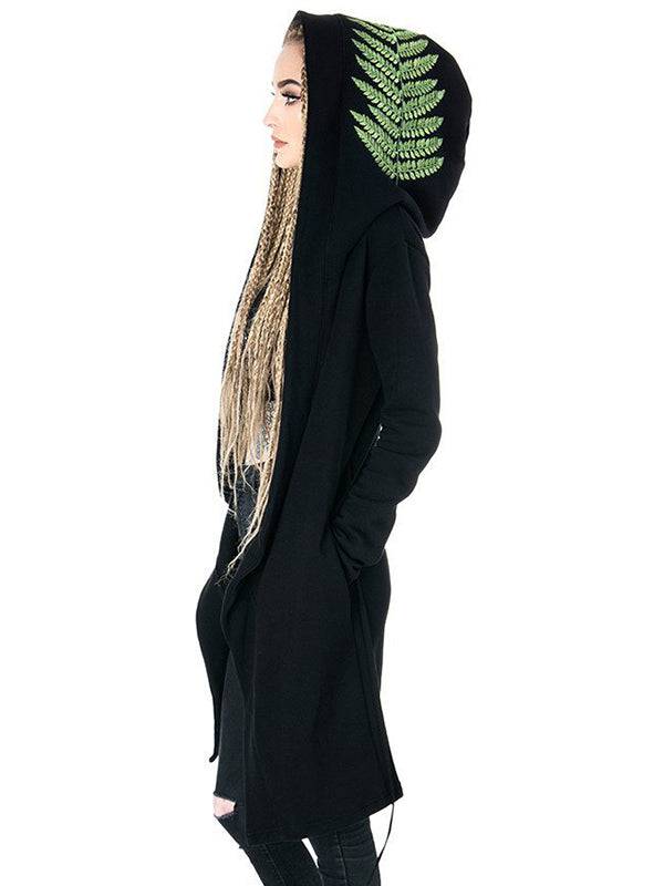 Ce long cardigan à capuche peut être noué à la taille. Il possède une immense capuche surdimensionnée avec une grande broderie de fougère. En coton très épais avec finition velours. Très chaud et super doux à l'intérieur. Etroit à la taille et évasé en bas. Deux grandes poches se trouvent sur les côtés.