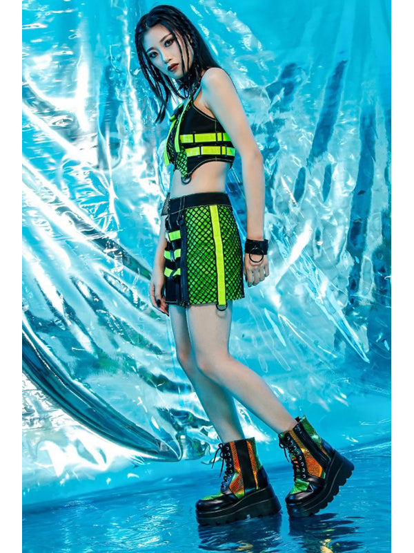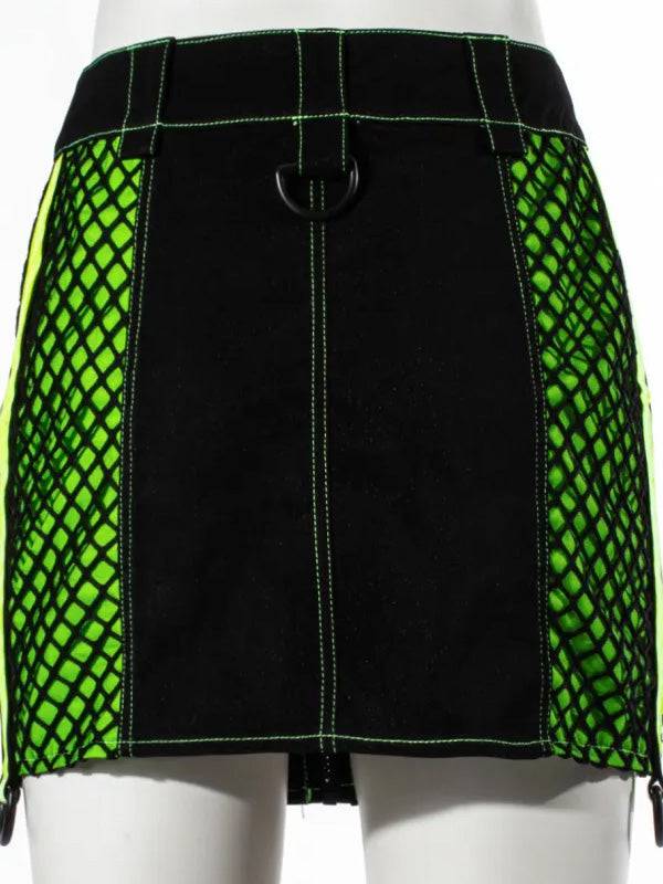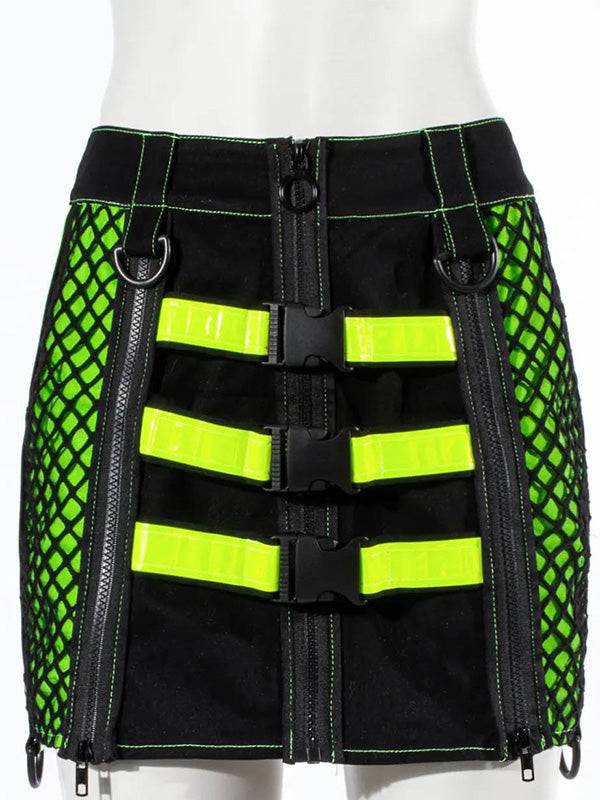 Jupe cyber/rave avec coutures contrastées, anneaux, bandes réfléchissantes vertes et boucles. Fermeture éclair sur le devant.