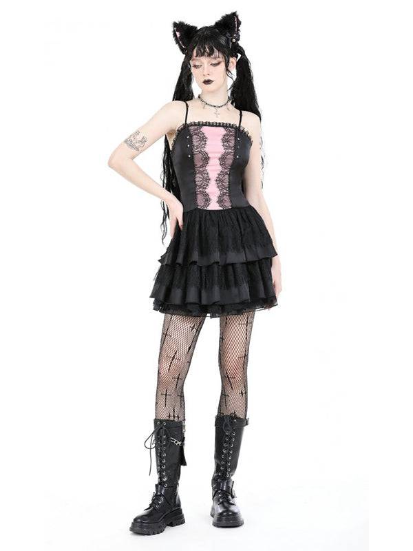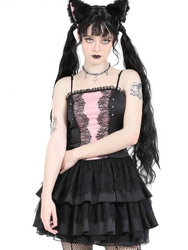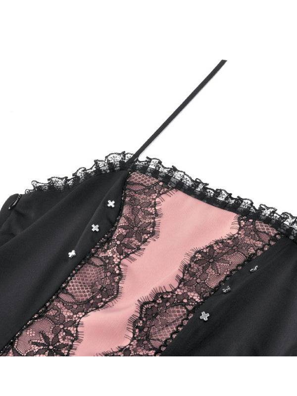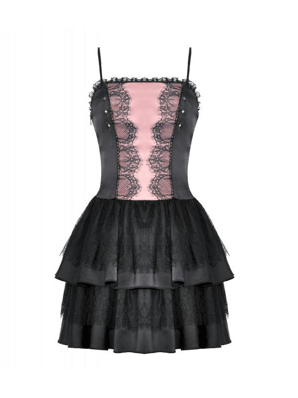 Robe noire et rose. Encolure bordée de dentelle. Bretelles réglables. Fronces au milieu du dos. Le tissu est composé à 97 % de polyester et à 3 % d'élasthanne.