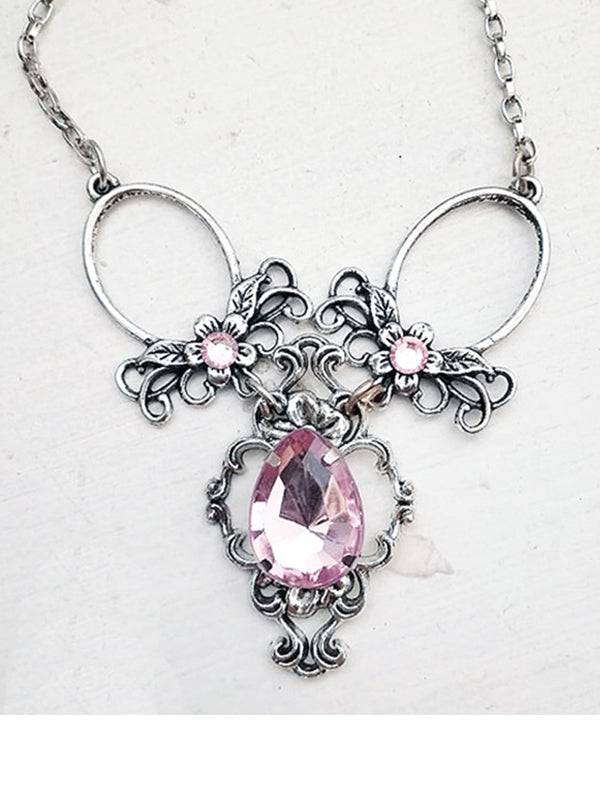 Beau collier argenté romantique orné de pièces délicates et gemme en forme de goutte rose.