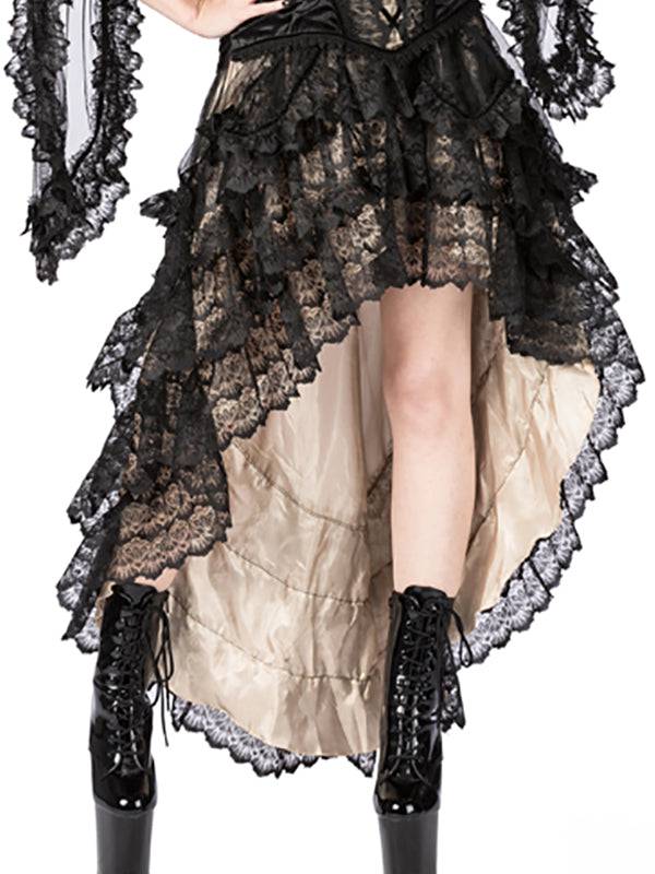 Jupe longue en mesh, satin et dentelle. Ceinture élastique.