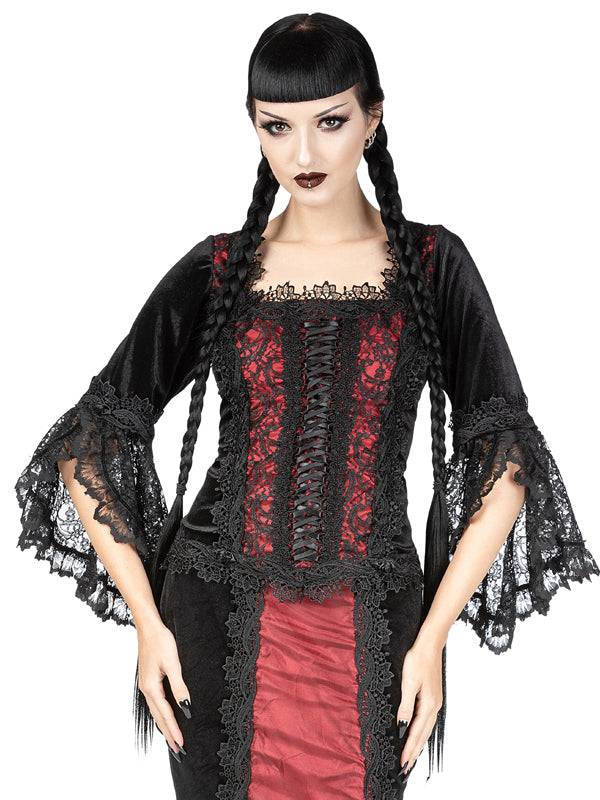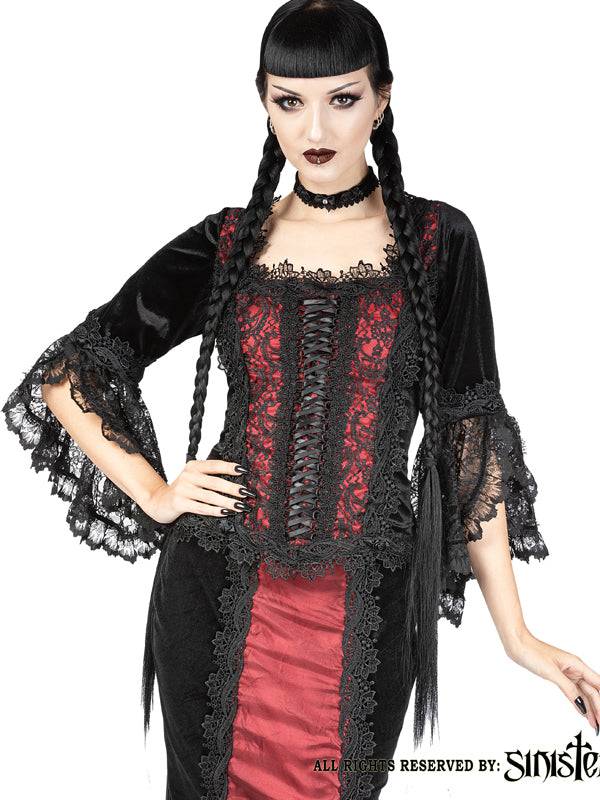 Haut Renaissance extrêmement détaillé avec une encolure carrée et des manches évasées. L'encolure, le devant, les manches et l'ourlet du haut en velours sont bordés de dentelle vénitienne. Devant en satin soyeux orné d'un ruban de satin noir à lacets. Des boutons de roses en satin noir ornent les manches et l'ourlet du haut. Fermeture zippée au milieu du dos.